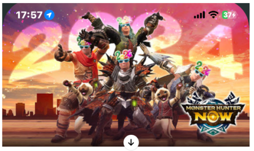 「Monster Hunter NOW」というタイトルのゲームの広告またはスプラッシュスクリーンを表示する画像です。ビジュアルは、それぞれ異なる鎧と武器を装備したゲームのキャラクターのグループを特徴としています。これは、プレイヤーが生き物を狩り、それらからリソースを使用して新しいギアを作ることができるモンスターハンターシリーズの特徴です。キャラクターは、建物の目に見えるシルエットを持つ様式化された日没の空を背景に設定されています。